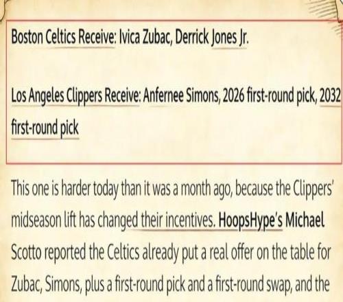 据悉,洛杉矶快船队的祖巴茨,一直是凯尔特人青睐的目标之一。知情人士透露,早在一个月前,凯尔特人便表达了对祖巴茨的兴趣,并提出了小西蒙斯+1个首轮签+1个首轮签互换权的报价,但遭到快船拒绝。