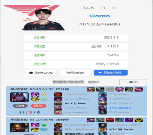 电竞资讯5月23日称 近日Doran在韩服狂玩上单豹女,昨日赛后Doran韩服操刀韦鲁斯,砍下11-3-5的华丽战绩。